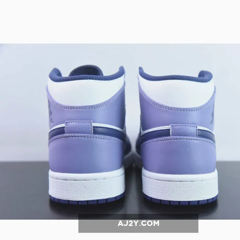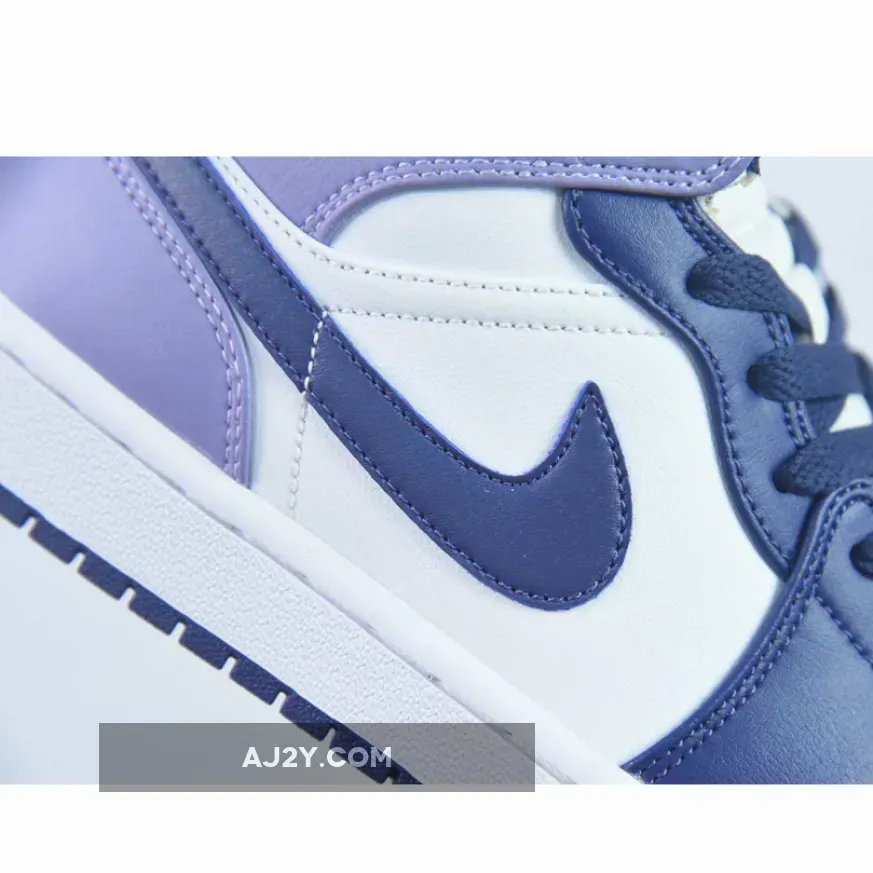 This offering of the Air Jordan 1 Mid features a full leather build on the upper with White serving as the base hue and two different shades of purple seen on the overlays.
