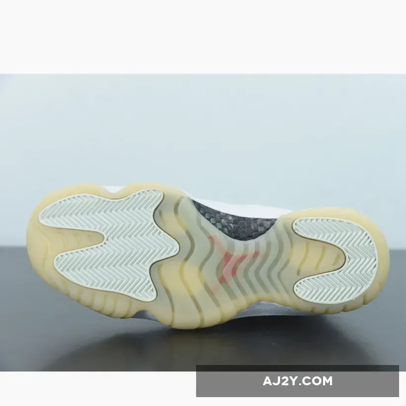 This Air Jordan 11 features a Sail mesh upper with a Platinum Tint patent leather overlay.