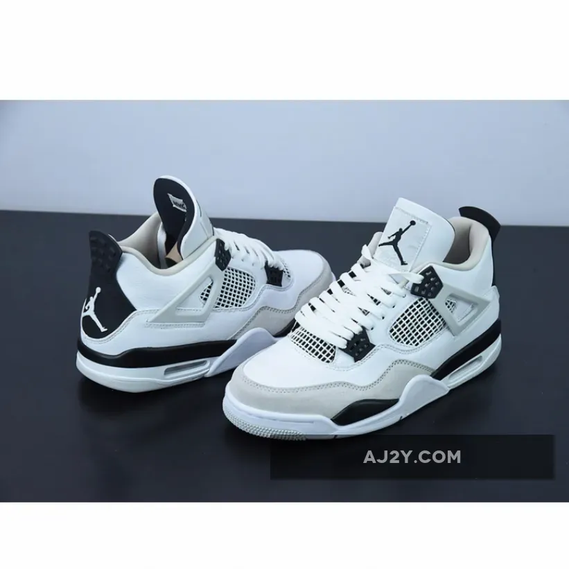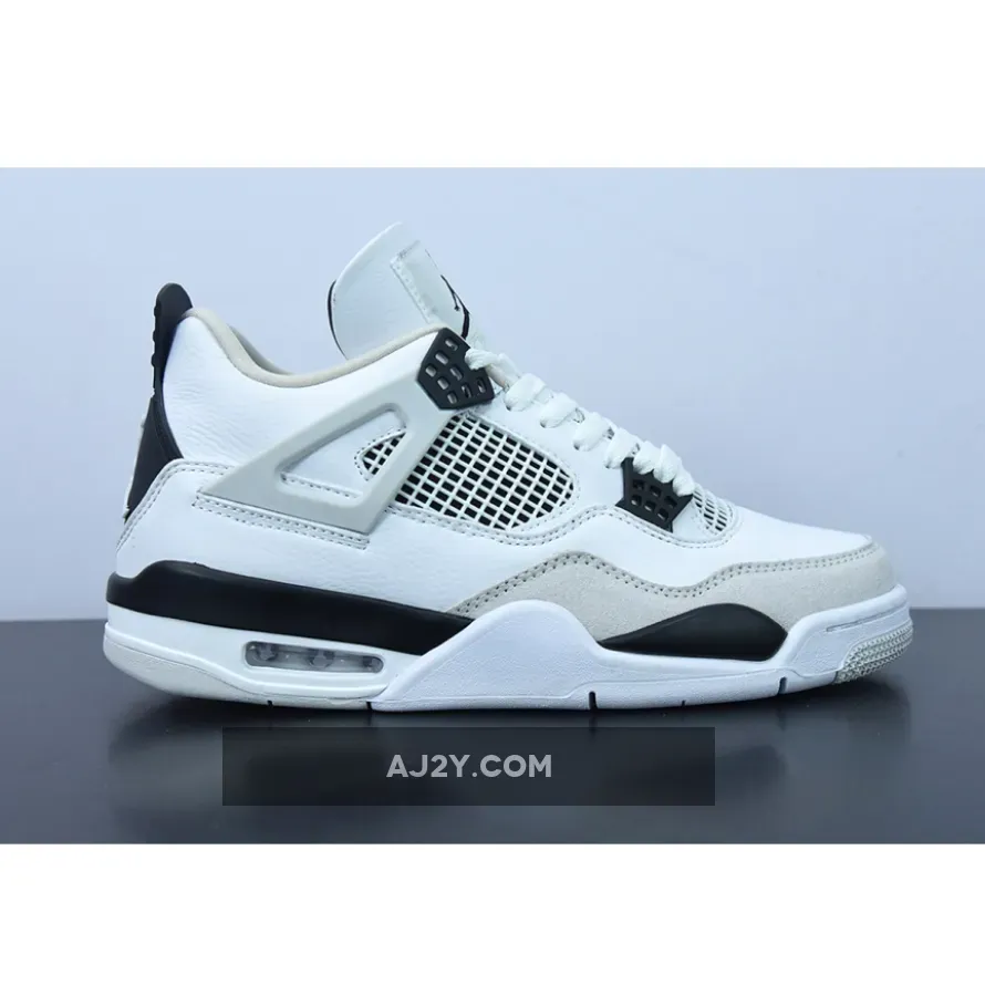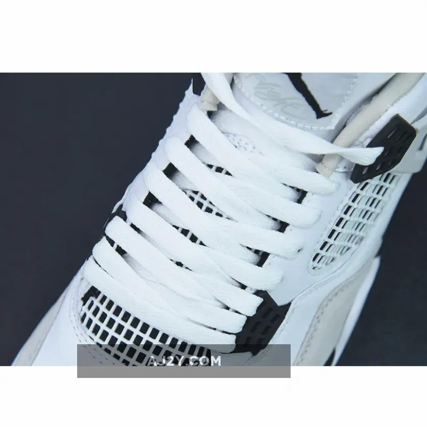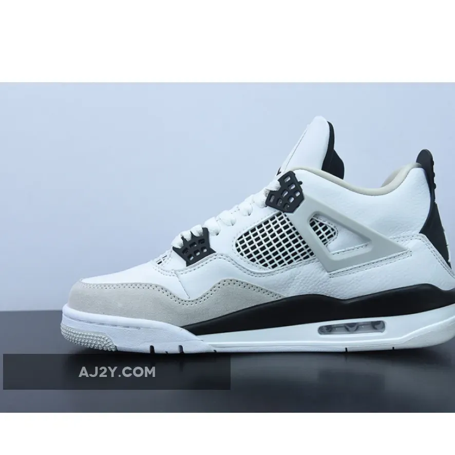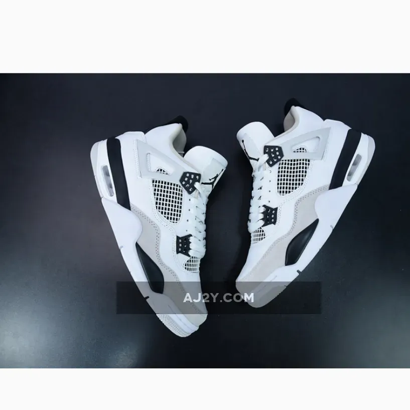 Smart take on the classic AJ4. Premium white leather & black accents deliver a sleek & versatile look. Air cushioning & paint splatter shoebox are sweet touches. #AJ4MilitaryBlack #NikeSneakers #MustHave