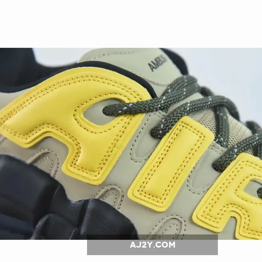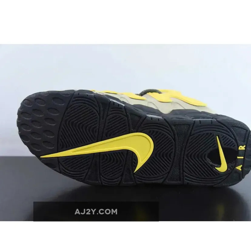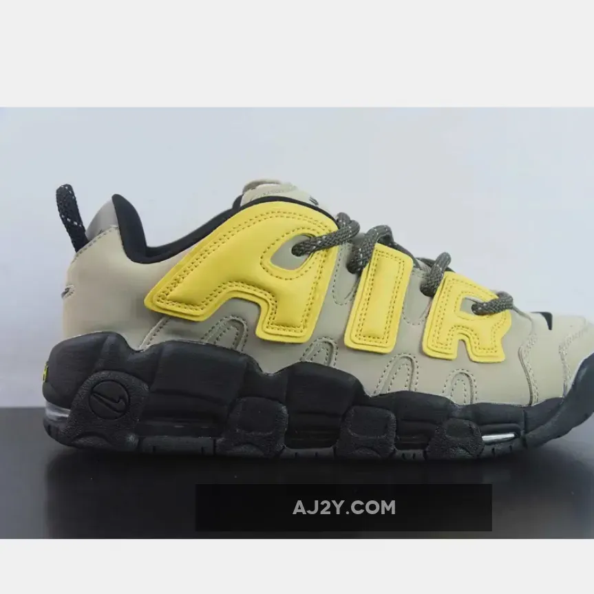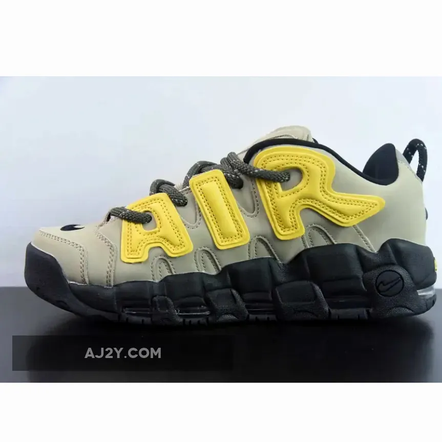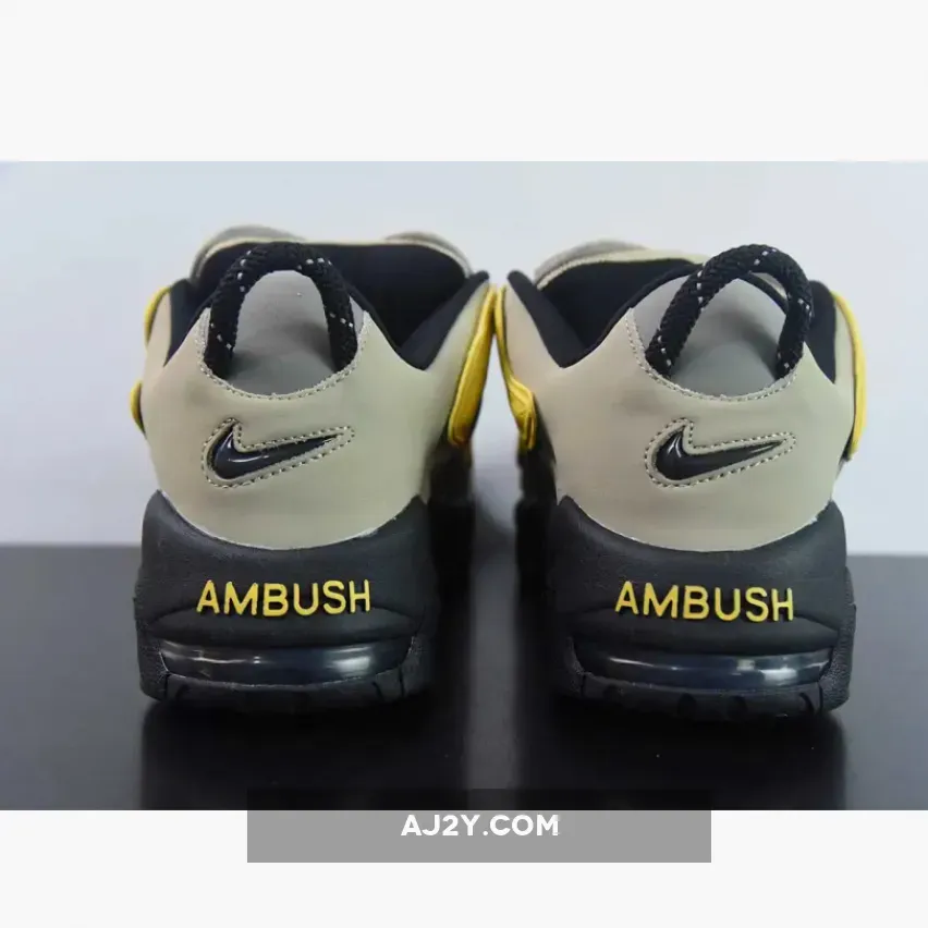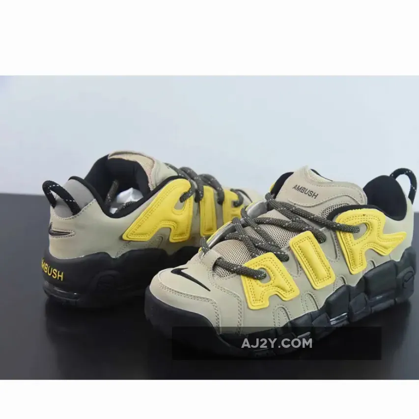 The Nike X Ambush Air More Uptempo Low ‘Limestoner’ features a Tan nubuck upper, Black embroidered mini Swoosh, and Yellow accents, creating a versatile look..