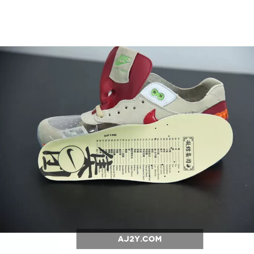 Centered around the same mix of “Net/Deep Red/Orange Blazer,” the suede upper is marked with snakeskin and ostrich detailing, accented by references to the ancient Chinese art of pressure point reflexology. CLOT embroidery appears on the updated reflective red heel tab and new reflexology chart insoles revealed by the new transparent TPU perforated toe cap reimagined for wearability. Additional branding comes in the form of patent snakeskin Swooshes and co-branded tongue tags. Elevating the shoes are bright orange midsoles and translucent rubber outsoles that obscure a print that maps out the pressure points of the foot. The special shoebox continues the Chinese traditional medicine inspiration and comes with a chart marked t0 correspond with the organs and parts of the body mapped on the bottom of the shoes