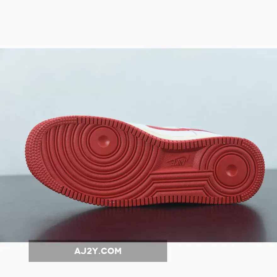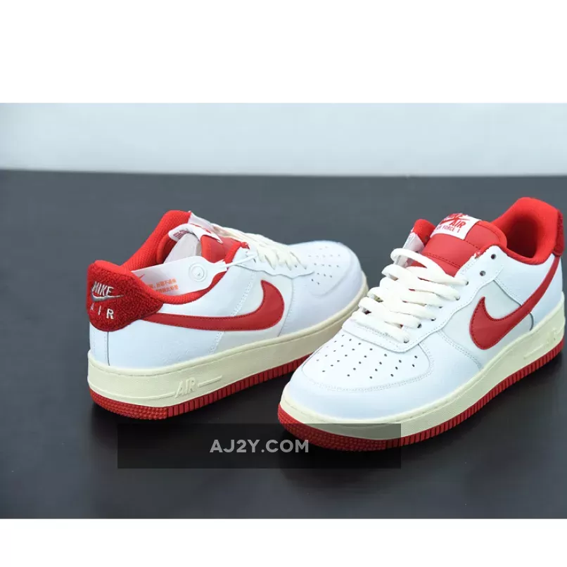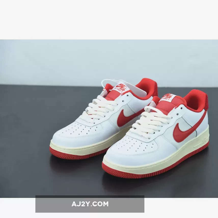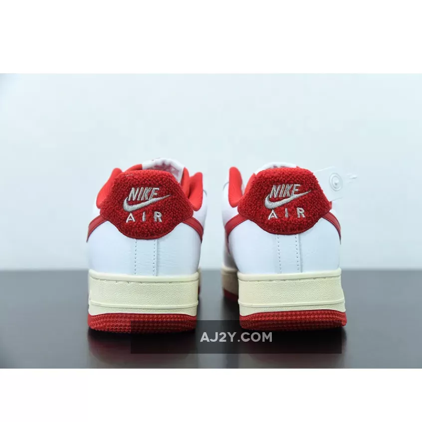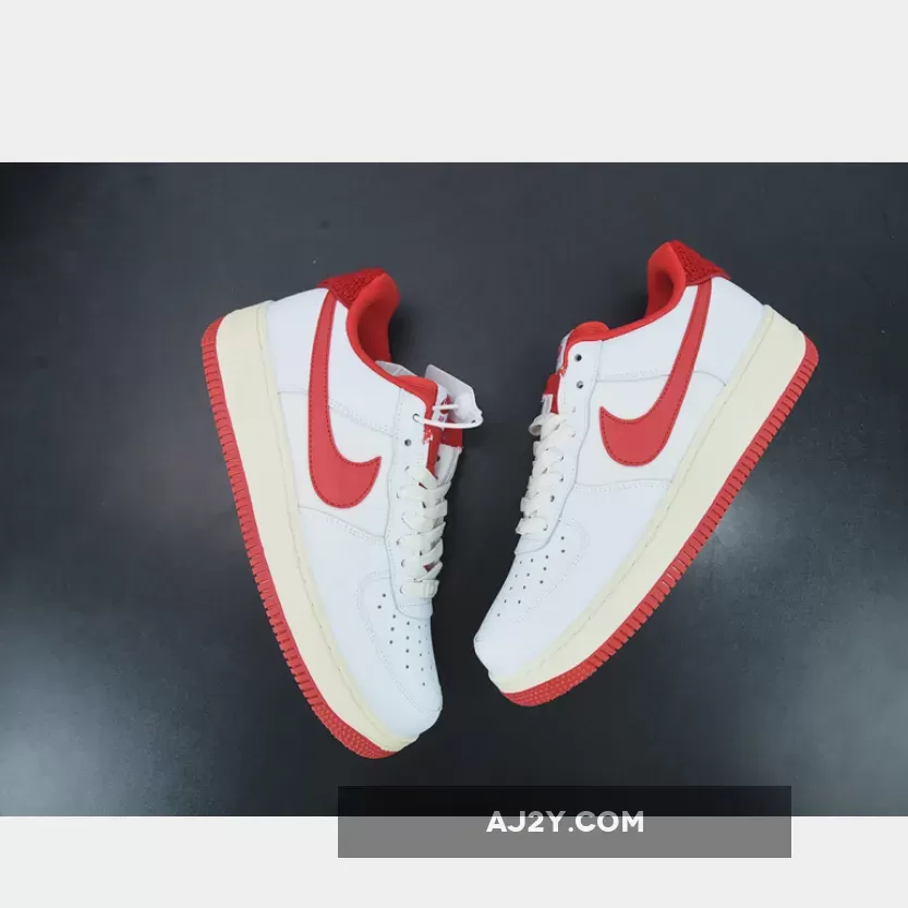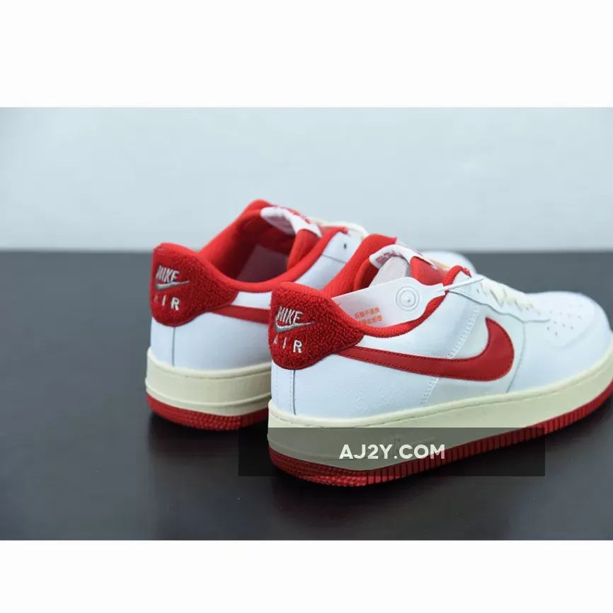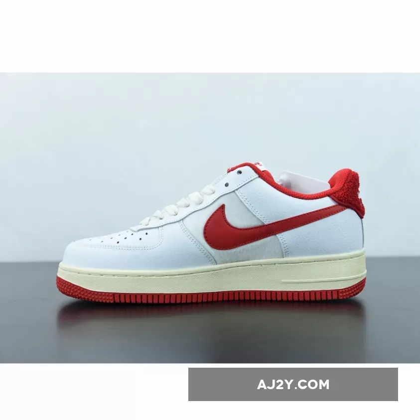 This offering of the Nike Air Force 1 comes dressed in a mix of White, Gym Red, and Sail. It features a White leather base with mesh side panels and Red detailing on the Swooshes, lining, tongues, rubber outsole, and chenille fabrics in the rear. White branded tongue labels, heels, and insoles atop a Sail midsole completes the design.