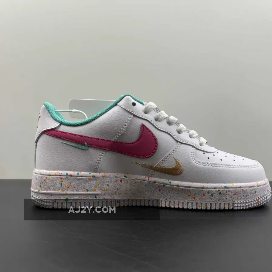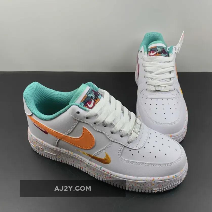 The Air Force 1 Low GS White Teal is a playful and eye-catching take on the classic AF1. The vibrant color scheme and unique details make it a standout pair of shoes. The classic white leather upper is complemented by bold Swooshes and embroidered Check marks. The paint-like specks on the sole add a touch of fun and whimsy. Overall, a bold and stylish sneaker perfect for those who want to make a statement.
