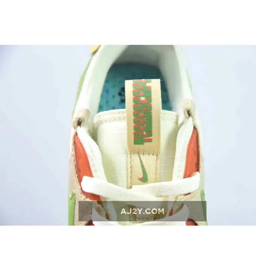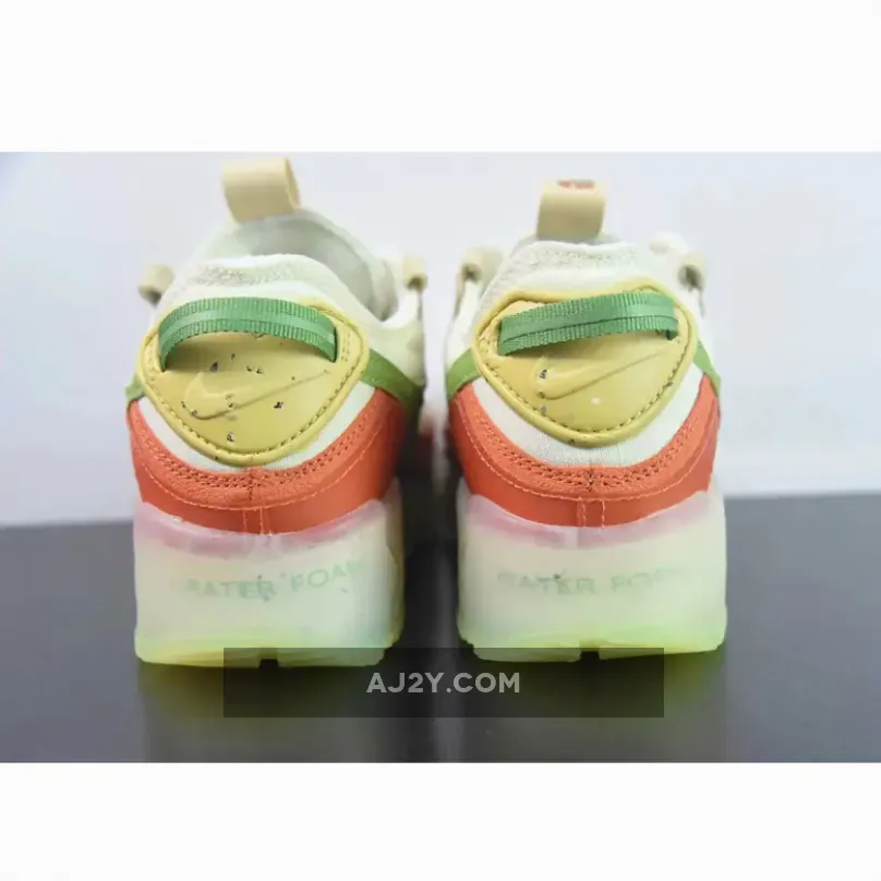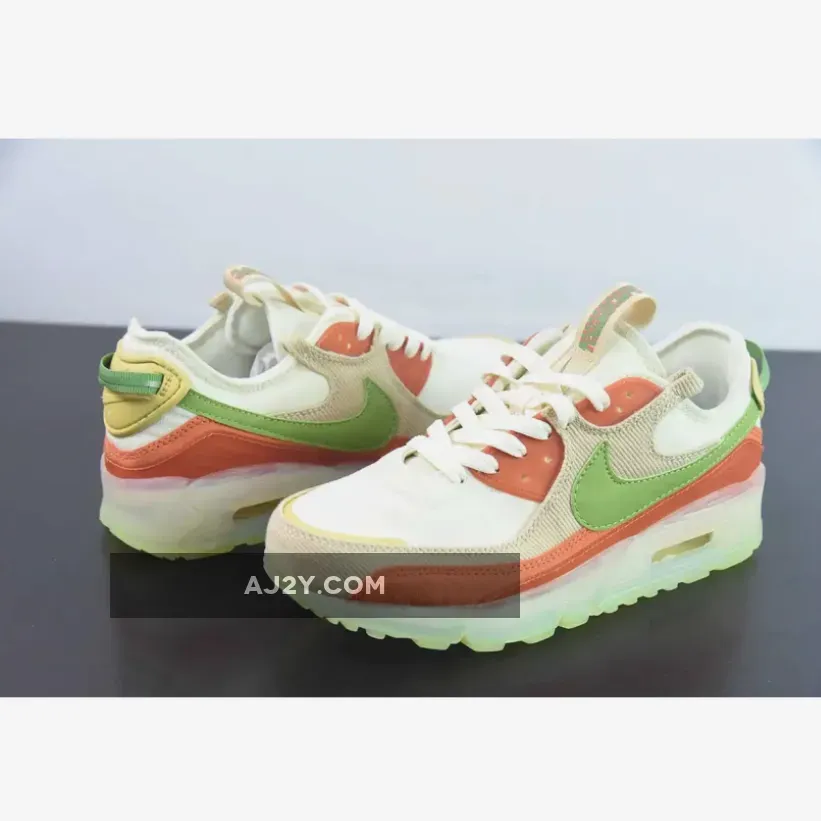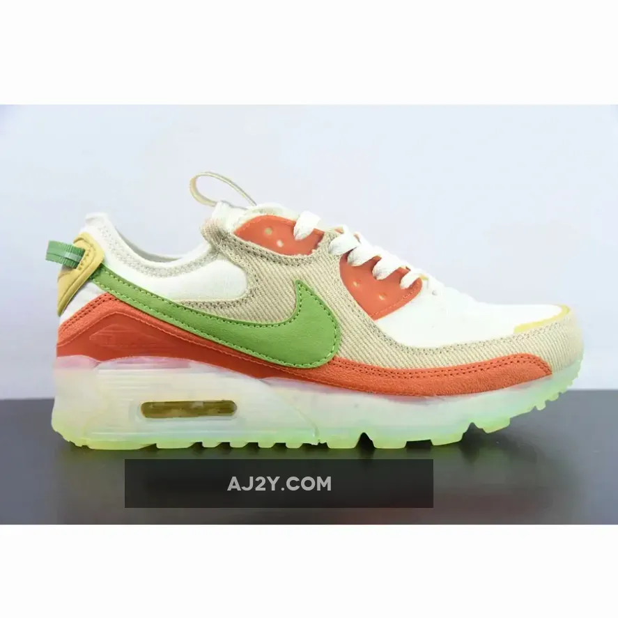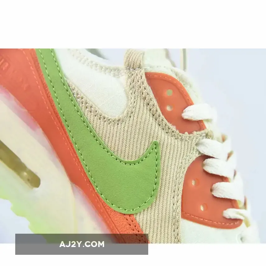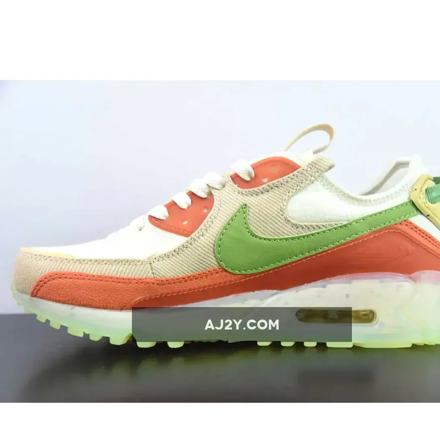 this Nike Air Max 90 Terrascape arrives in a mix of Orange and Green color tones. The light neutral textiles, playin’ with shades of tan, wrap your feet in a cloud of comfort. It’s like walking on a bed of moss, hiking through lush greenery wherever you go. Constructed out of the aforementioned recycled fabrics and materials, design details include the “Terrascape” branding on the tongue pull tabs and insoles atop a semi-translucent Crater Foam midsole and Nike Grind speckled outsole.
