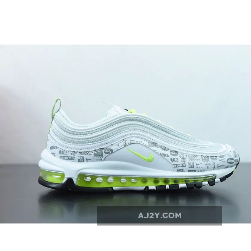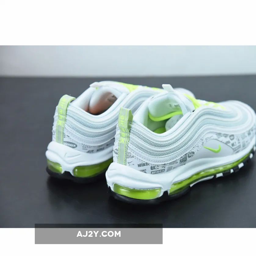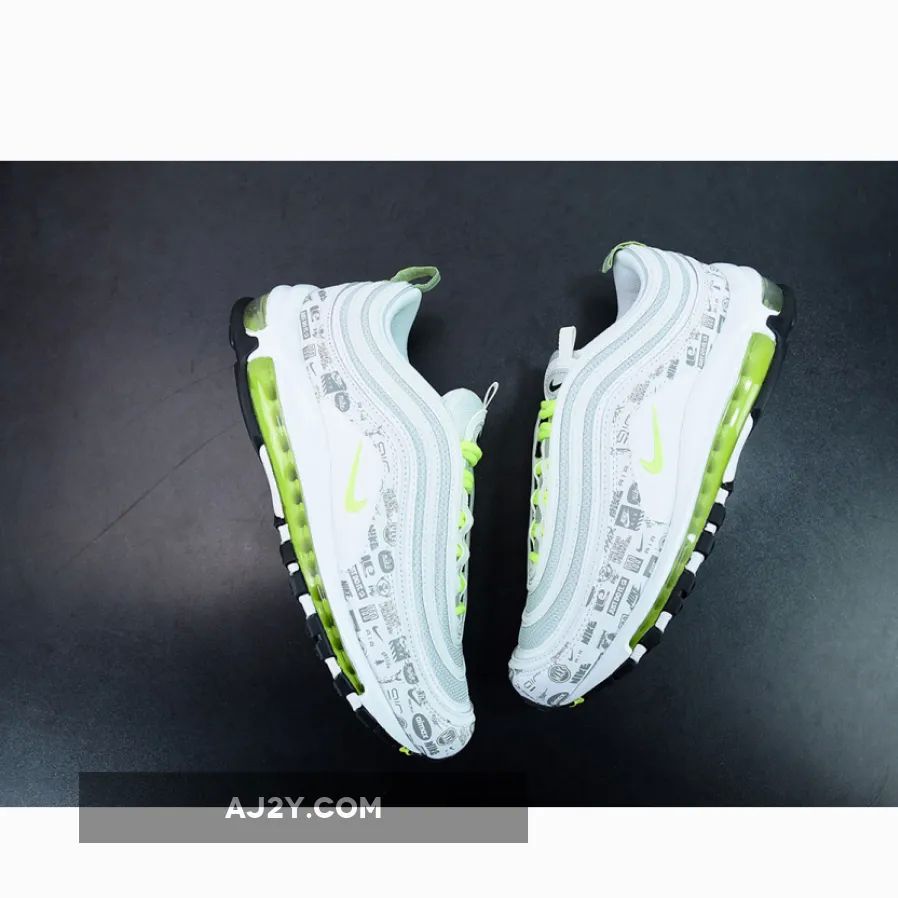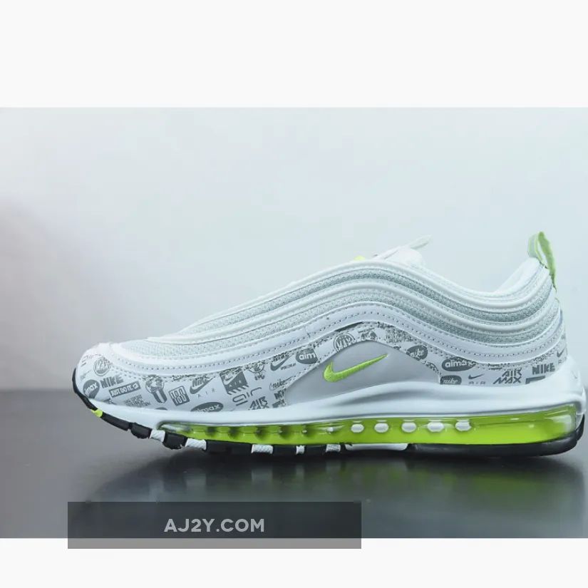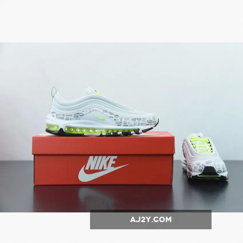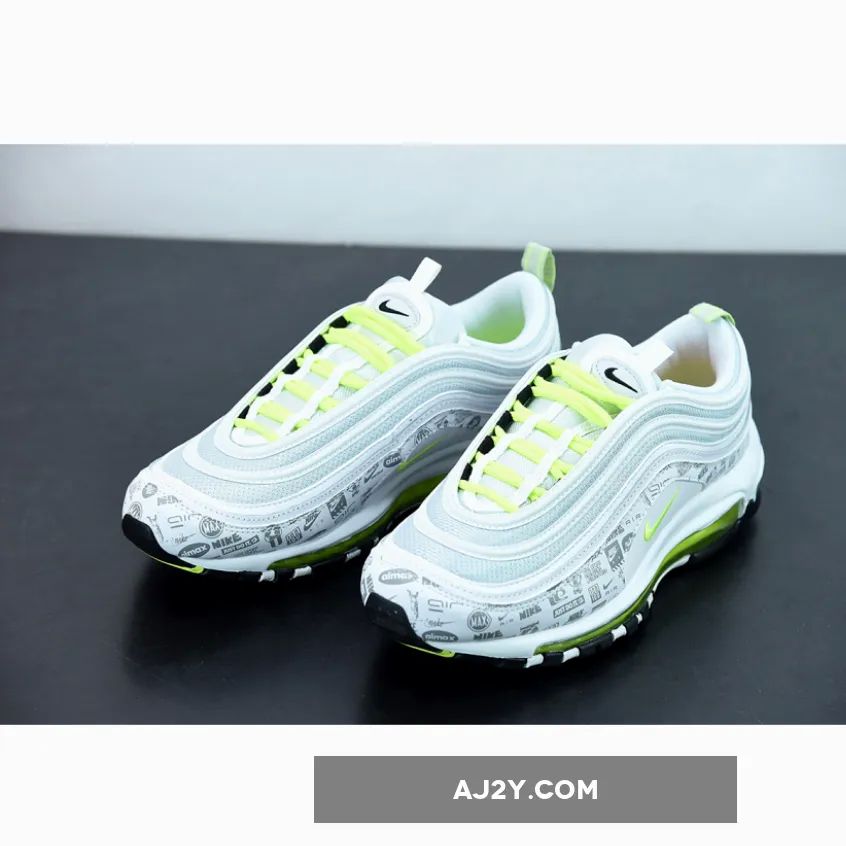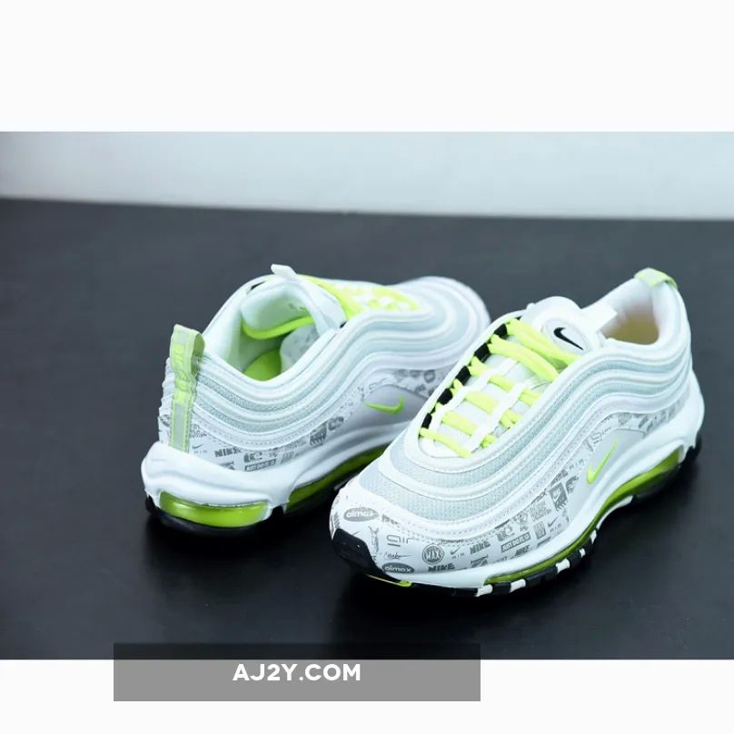 The colour arrangement predominantly consists of white but paired with vibrant Volt accents marking the rope laces forefoot, the rear pull tabs, the mini Swoosh logo midfoot, and the visible full-length Air unit beneath the feet. Across its side mudguards, a plethora of miniature sized Nike branding motifs makes its way across from the toes all the way to the heels, delivering a themed look to the model.