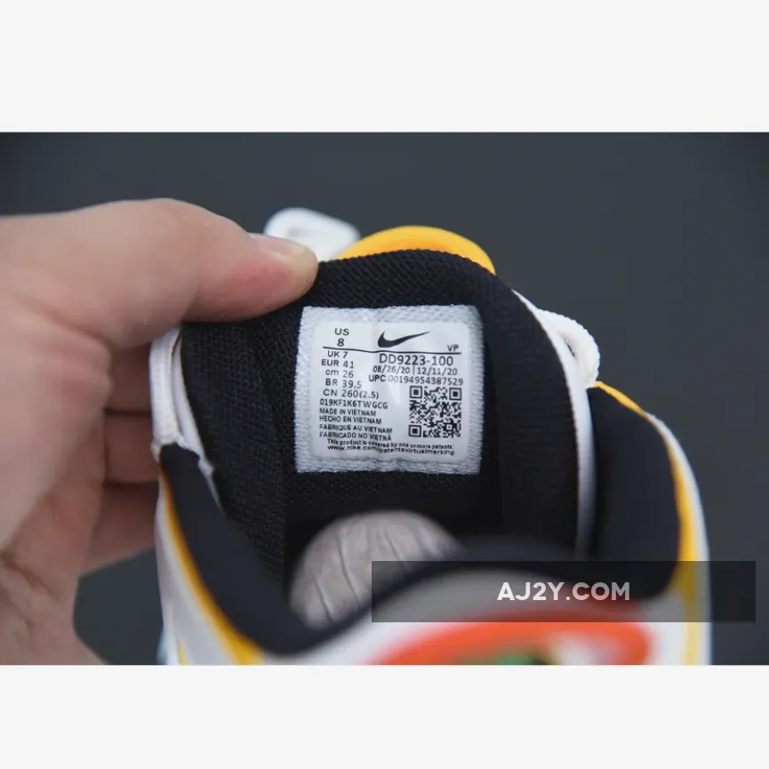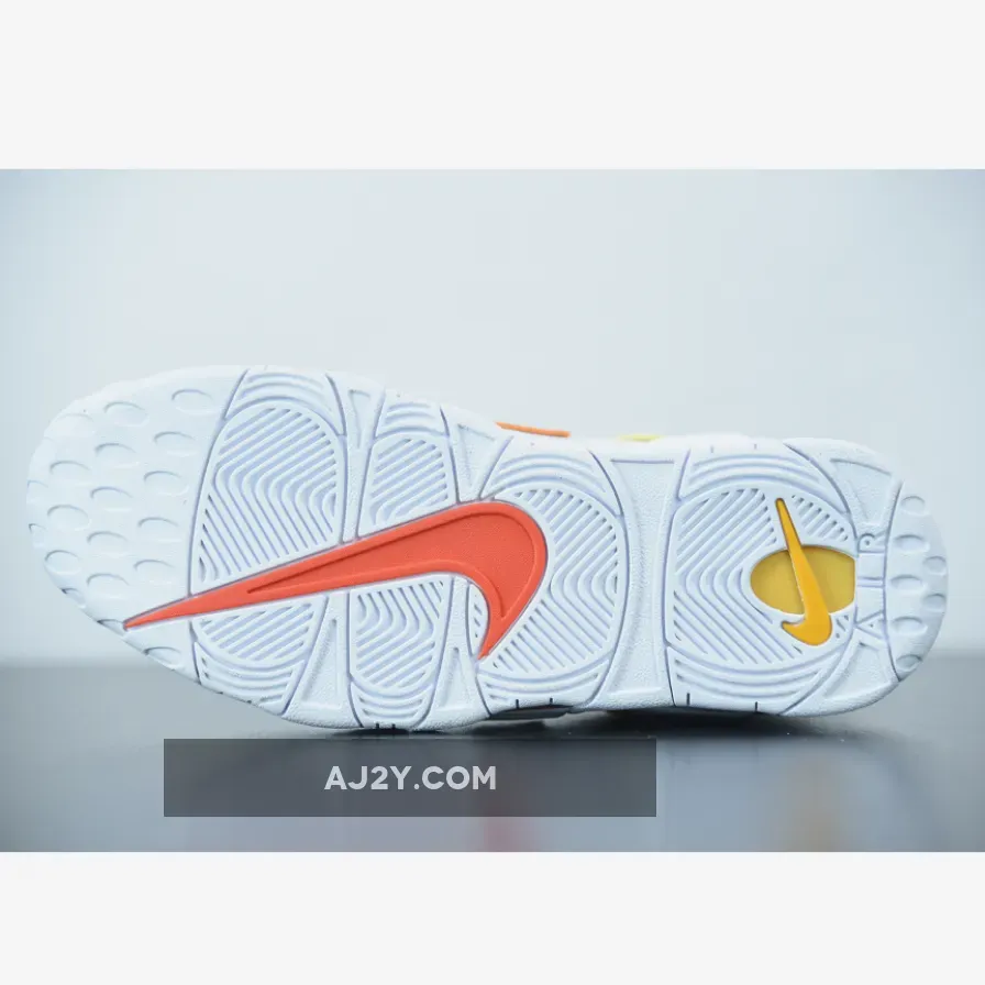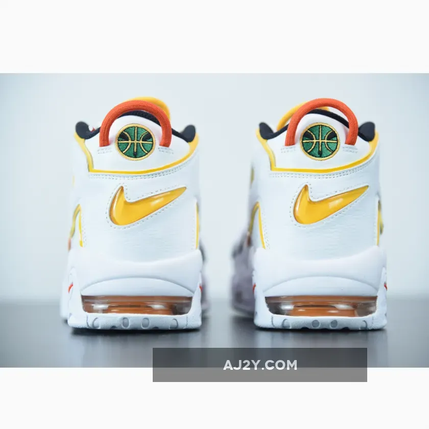 The Nike Air More Uptempo Raygun is constructed of white leather with hits of red, black, and yellow outlining big bubble “AIR” lettering on each lateral side. Yellow Swooshes are located on the toe and heel and the appearance of a Roswell Rayguns basketball logo embroidery on the heel, an orange patent leather patch on the tongue, and a white sole with a full-length Air unit conclude this 90s era basketball shoe.