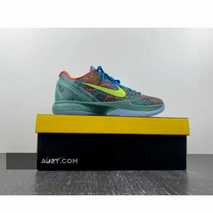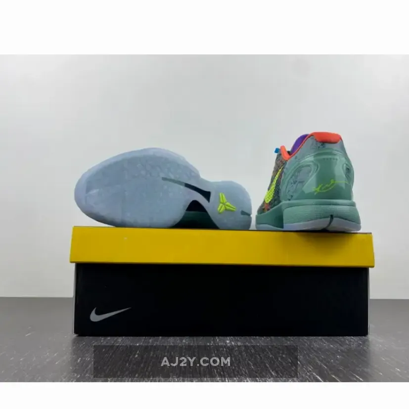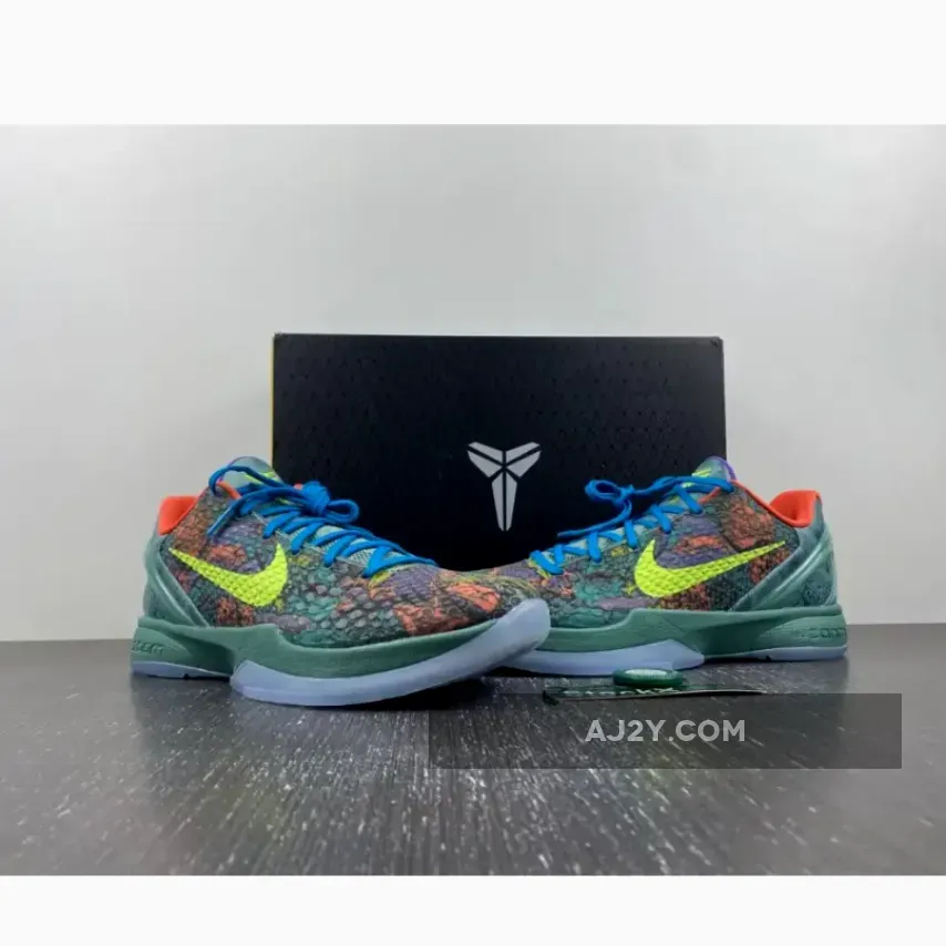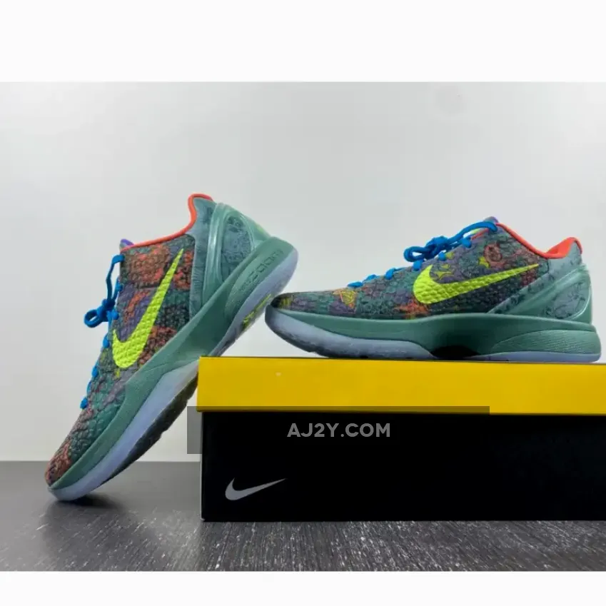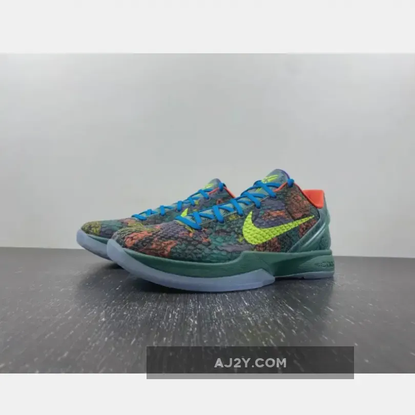 The Kobe 6’s signature snake-like upper is coated in a multicolor look with graphics and feature the ocean, fish, octopus, and sharks. Same animal, different beast and split by bold volt branded hits. Though its look is nearly identical to the 2012 release, it features updated Protro construction with an upgraded last, softer midsole foam, a larger Zoom Air cushioning unit in the forefoot and an outsole pattern with an increased surface area for better grip.
