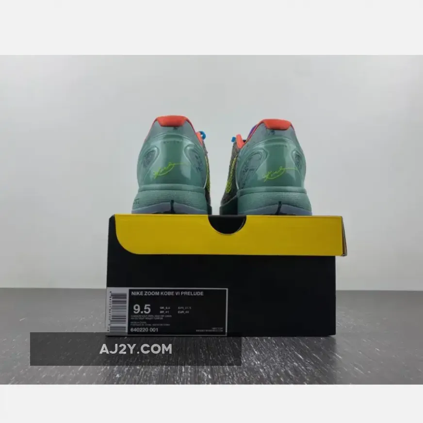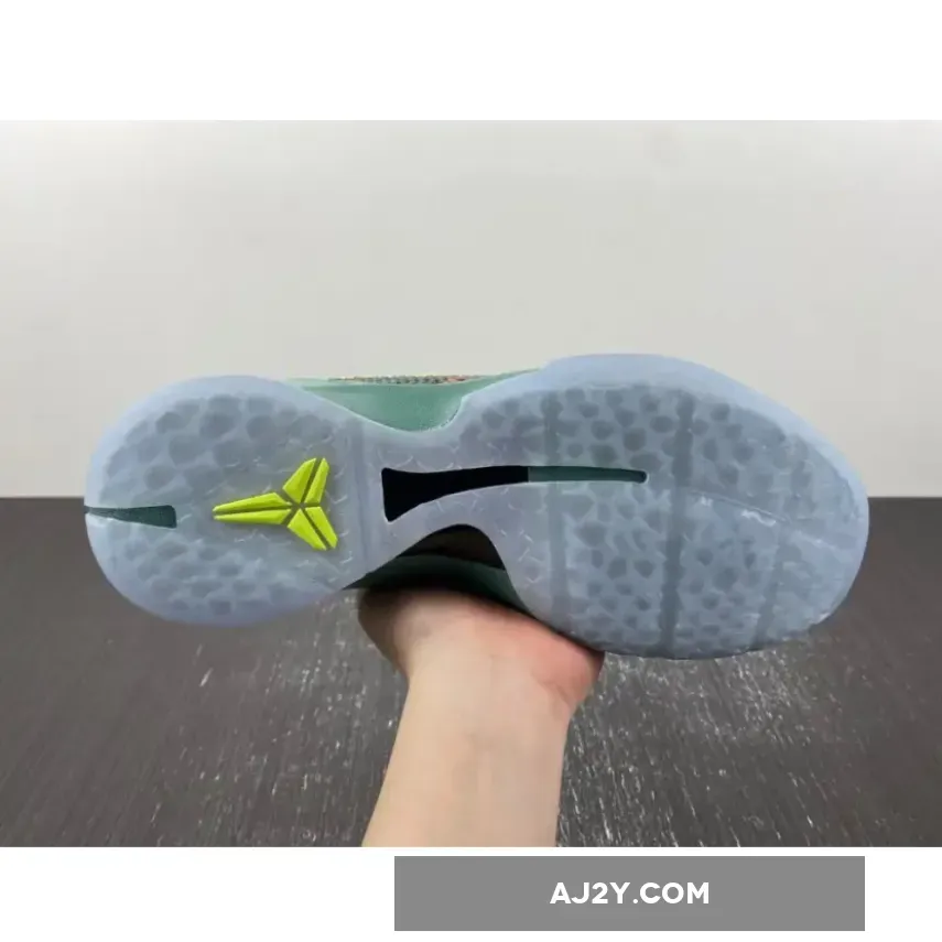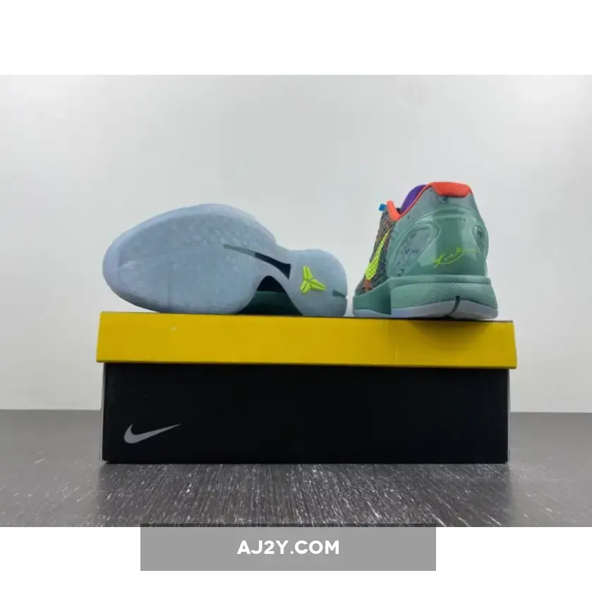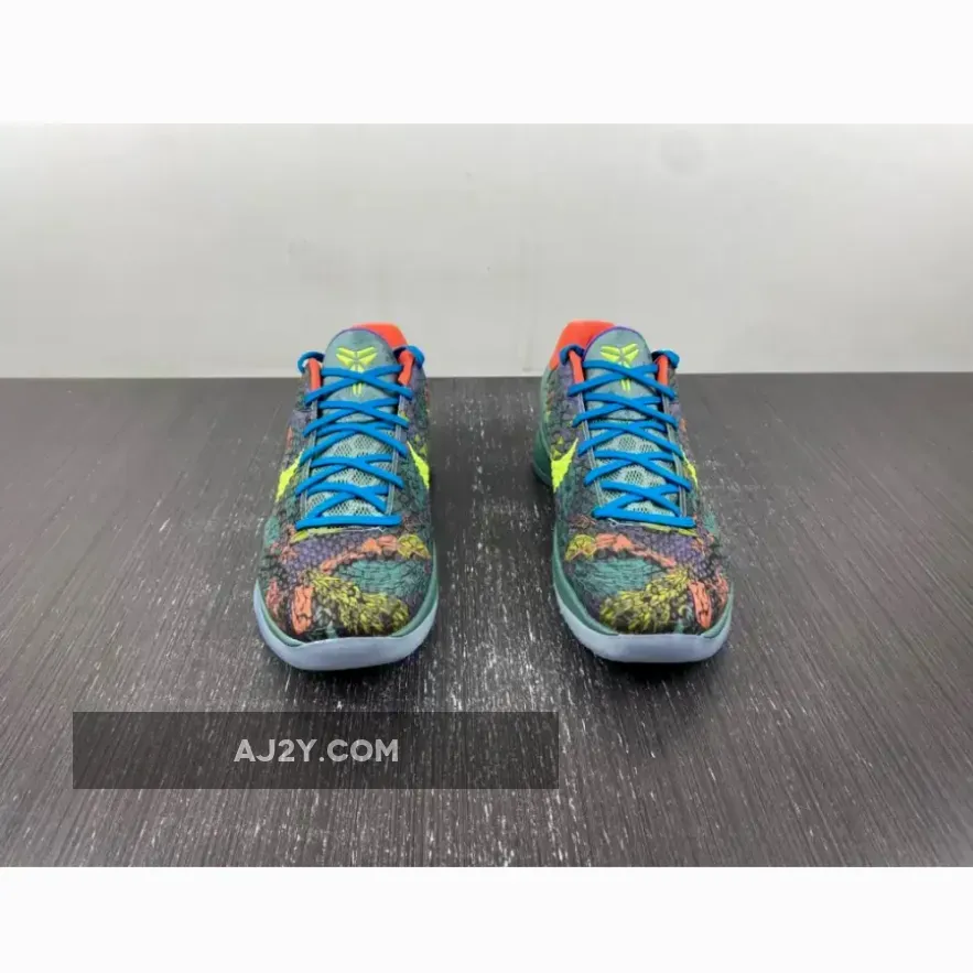 The Kobe 6’s signature snake-like upper is coated in a multicolor look with graphics and feature the ocean, fish, octopus, and sharks. Same animal, different beast and split by bold volt branded hits. Though its look is nearly identical to the 2012 release, it features updated Protro construction with an upgraded last, softer midsole foam, a larger Zoom Air cushioning unit in the forefoot and an outsole pattern with an increased surface area for better grip.