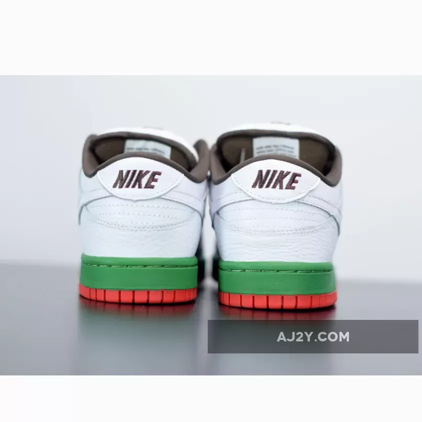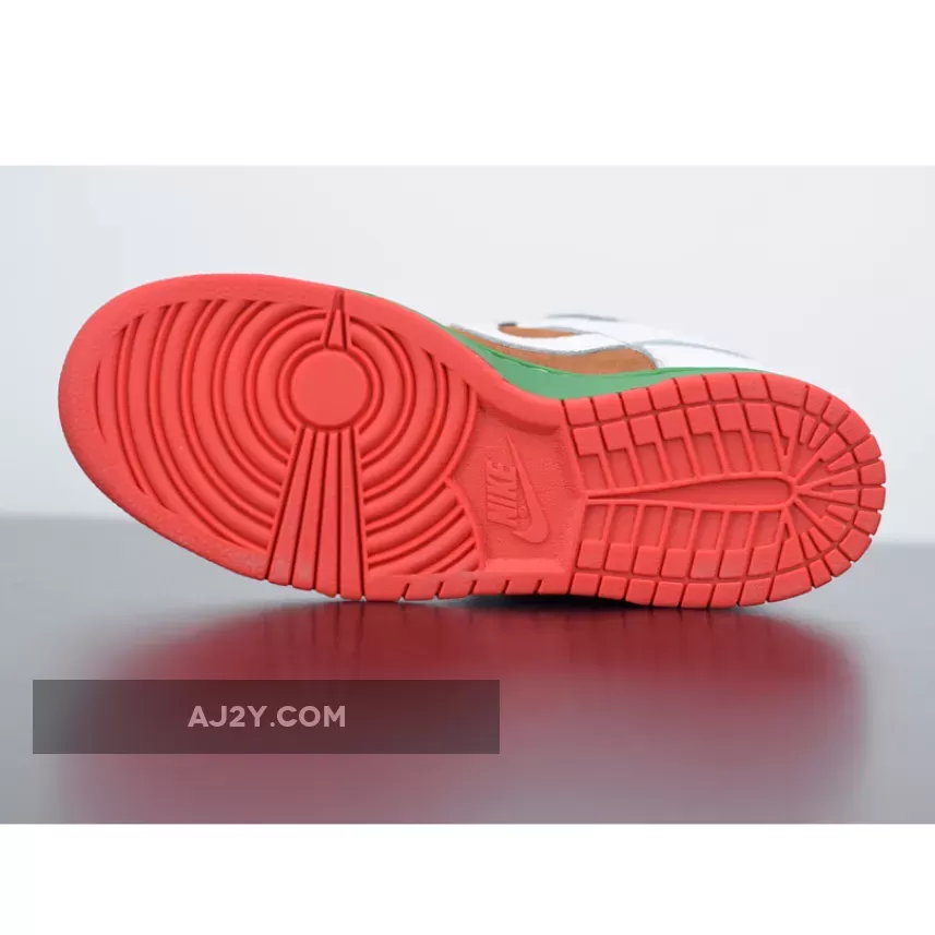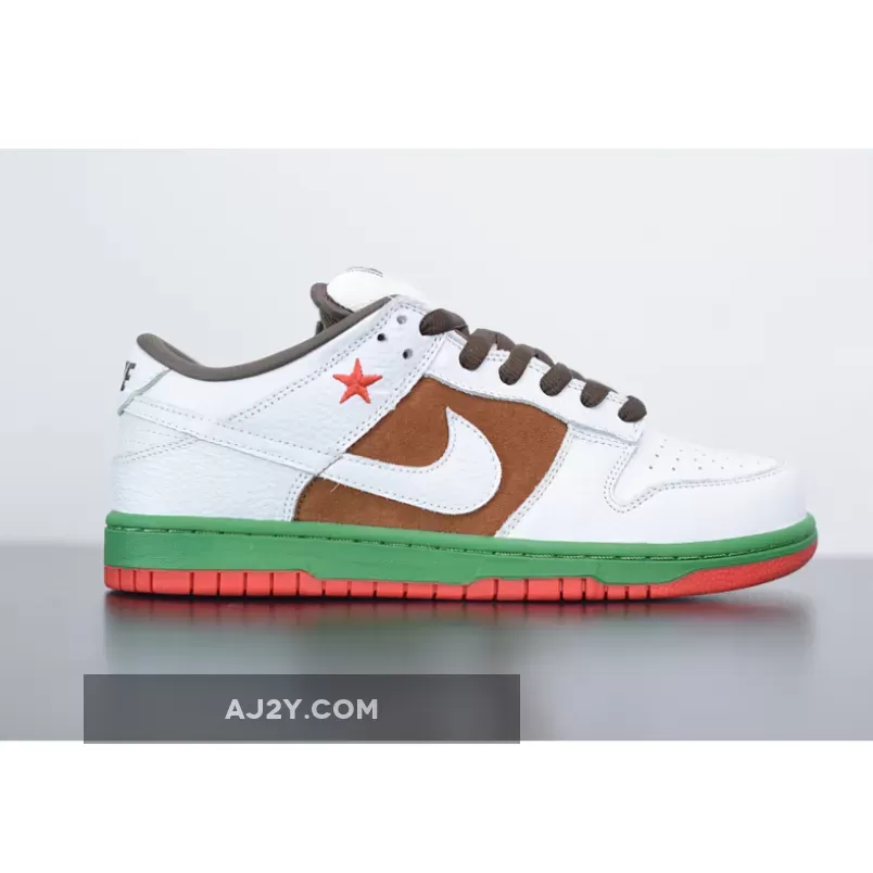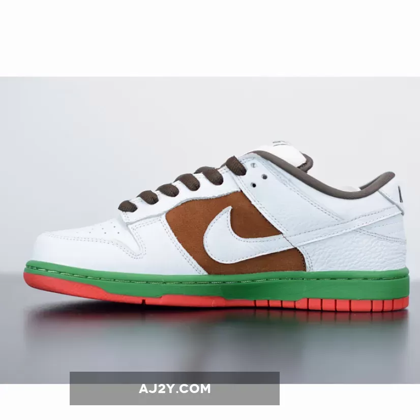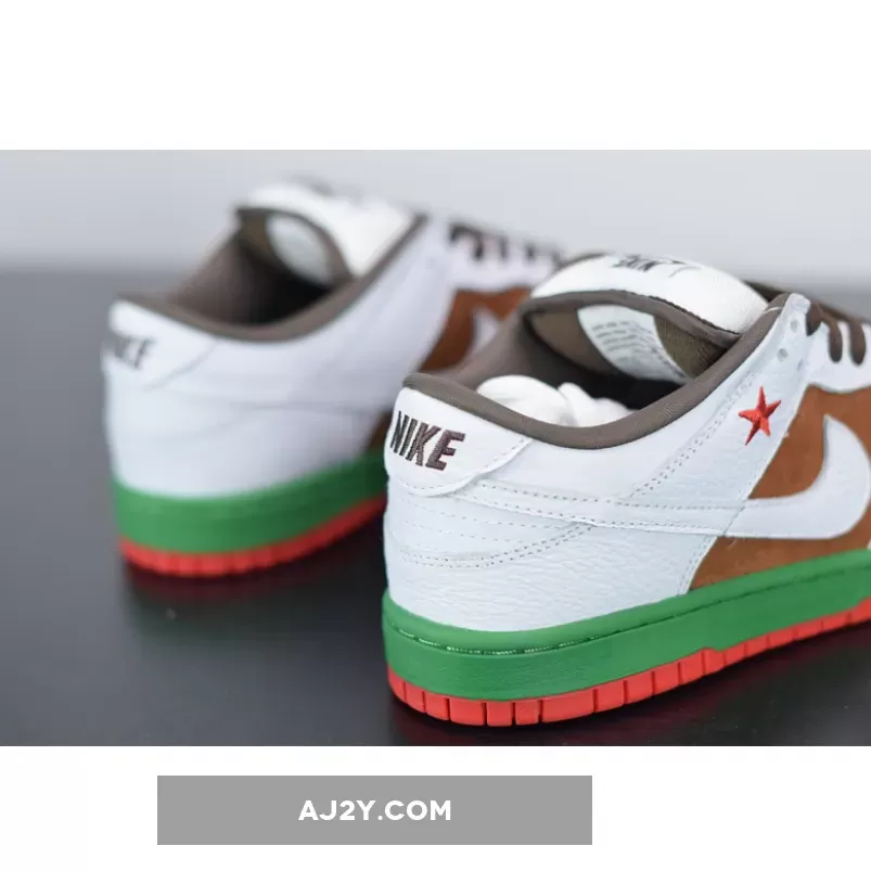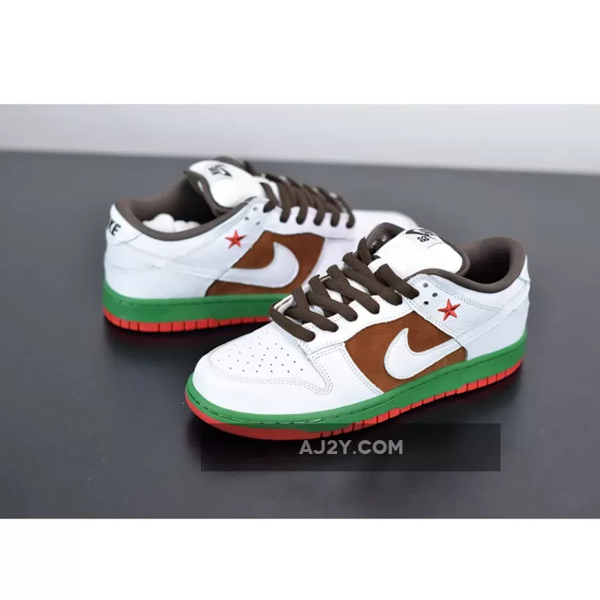 These Dunks were inspired by the California state flag, hence the nickname Cali. They shoes have a brown suede side panel, representing the bear, while the green midsole resembles the grass upon which the bear is standing. The red outsole is for the red stripe at the bottom of the flag.