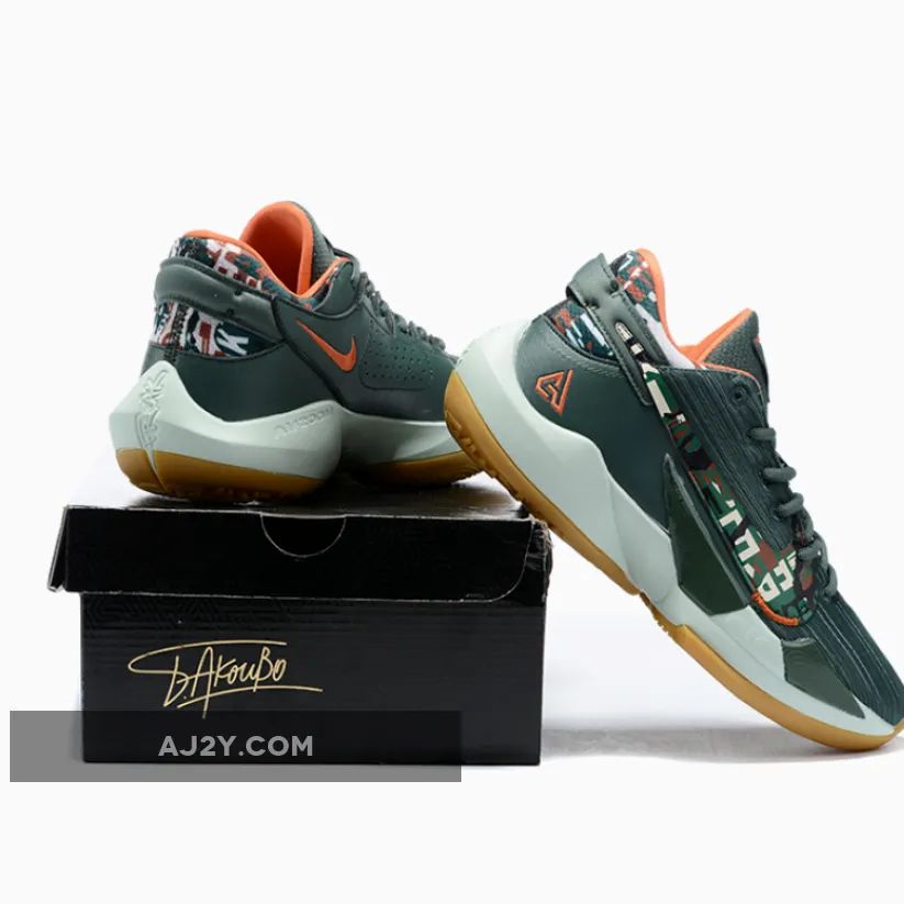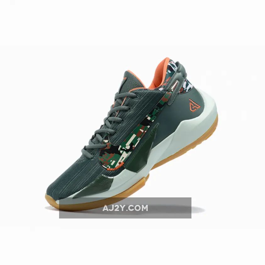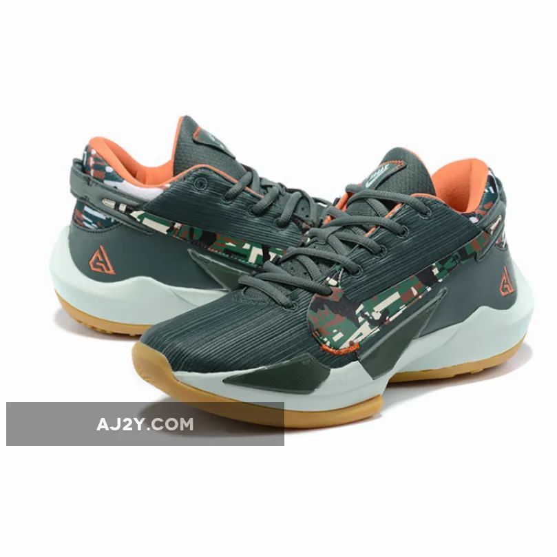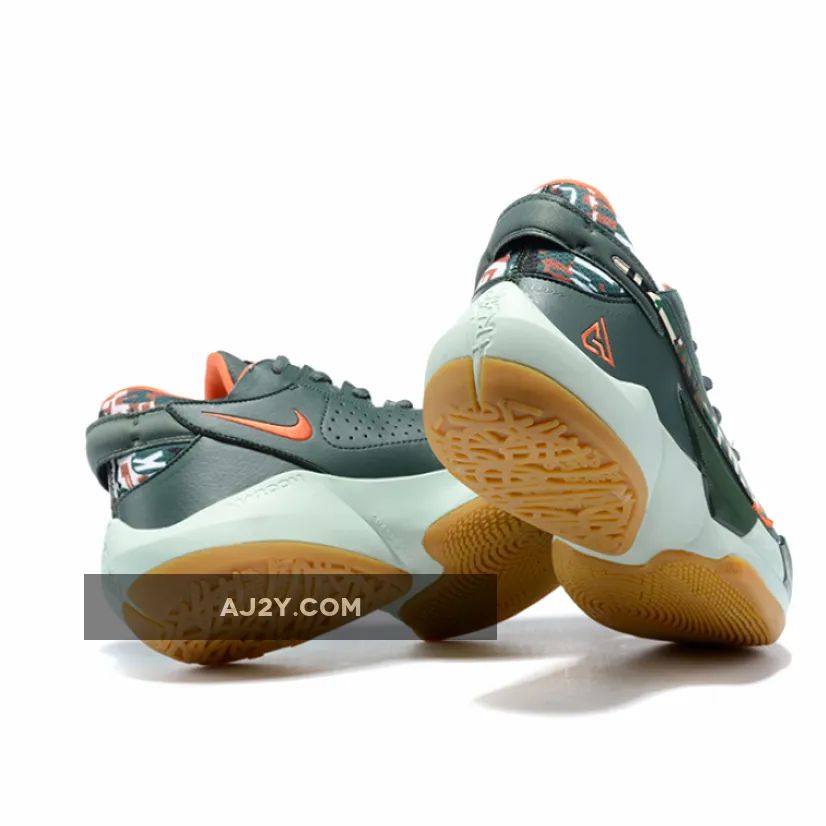 This offering of the Nike Zoom Freak 2 features a Vintage Green mesh upper with leather in the rear. Camouflage print covers the Swooshes and heel while having pops of Orange on the inner lining and signature “GA” heel logo. A White midsole atop a Gum rubber outsole completes the design.