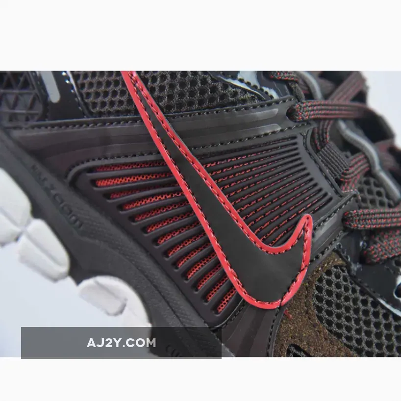 Smaller notes of a muted red accent through the flecked laces, borders of the Swooshes as well as the mesh layers that lie beneath the aforementioned cage.