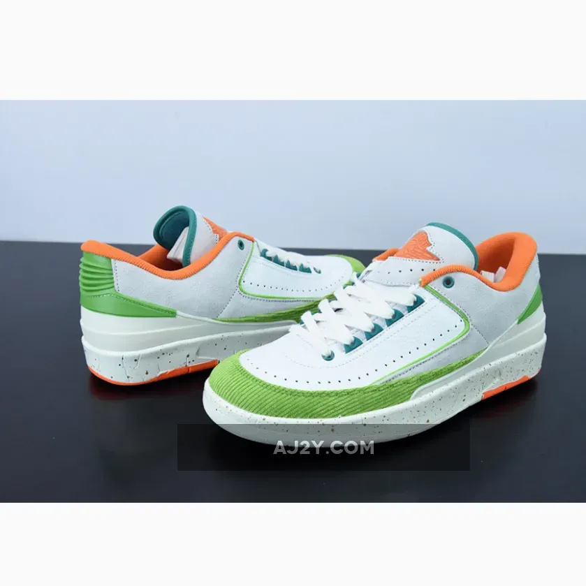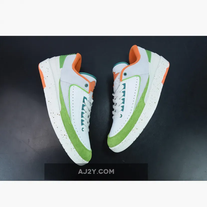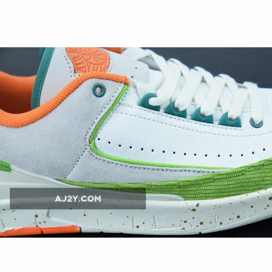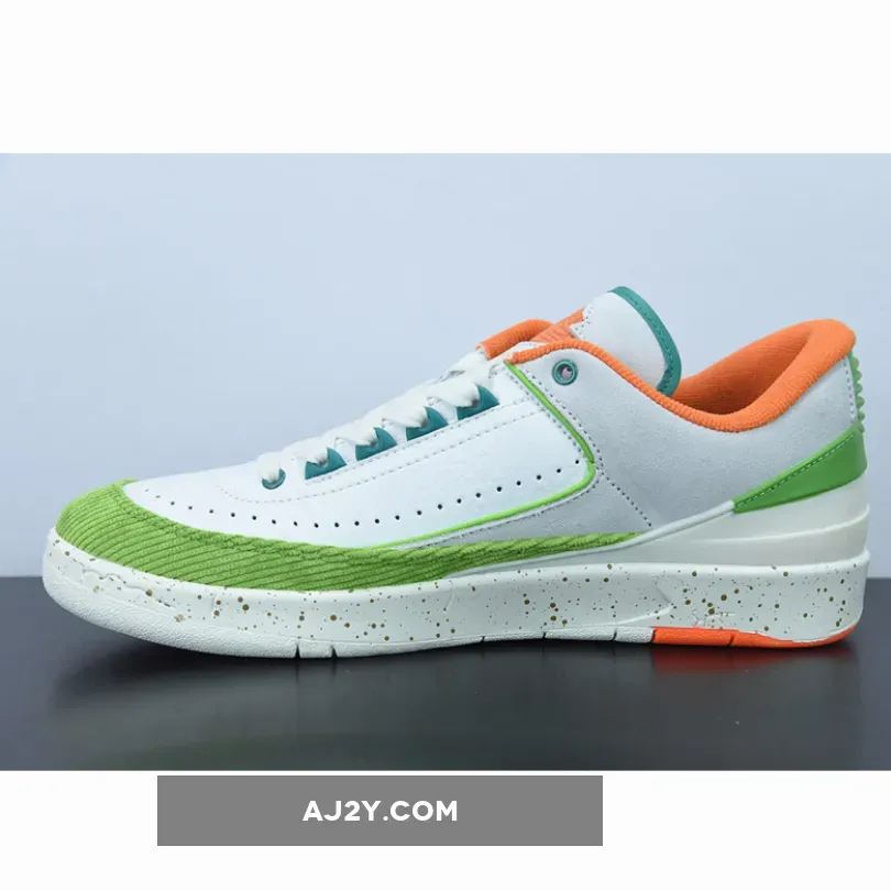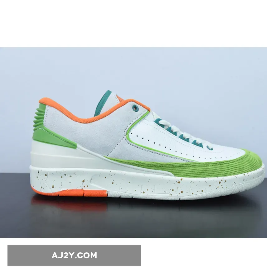 Dressed in a Sail, Safety Orange, Chlorophyll, and Coconut Milk color scheme. This offering of the low-top Air Jordan 2 features a White leather base with Grey suede overlays and Chlorophyll Green corduroy mudguards. Other details includes Orange accents on the sockliner and Jumpman tongue logo, while hits of Teal appear on the eyelets and lip of the tongue. A speckled midsole atop a Sail rubber sole with a custom Titan-branded hangtag completes the design. As of now, the inspiration behind this release is current unknown, but its highly likely to have a strong connection to the Philippines.