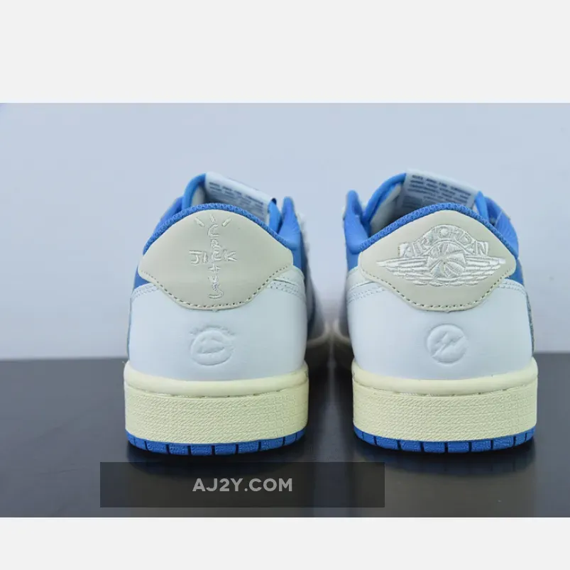 Fresh images of a pair of Travis Scott x Fragment Design Air Jordan 1 Low in a new “UNC Blue” colorway have just surfaced. The pictures show the collaborative sneaker in a Blue/White/Sail color scheme—with the titular blue shade featured on the suede upper and outsole, white on the leather overlays and Nike’s Sail color on the inverted Swoosh, heel tab and midsole.